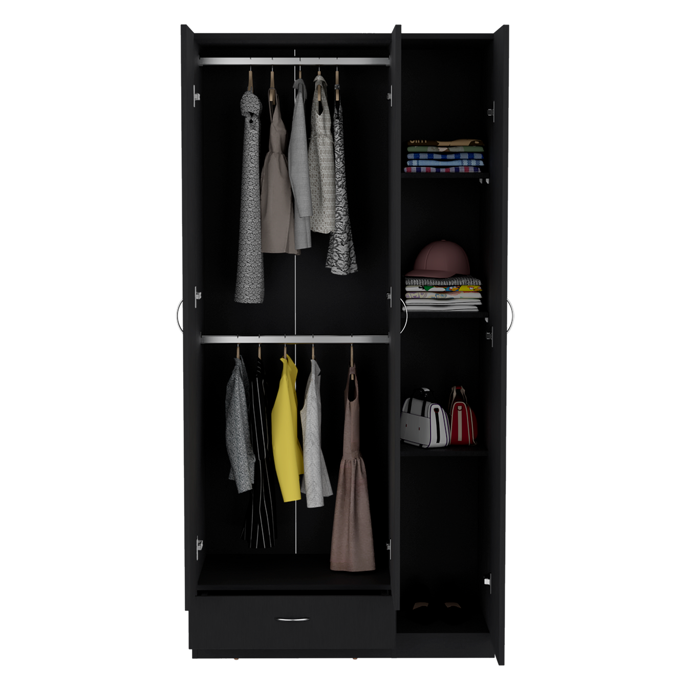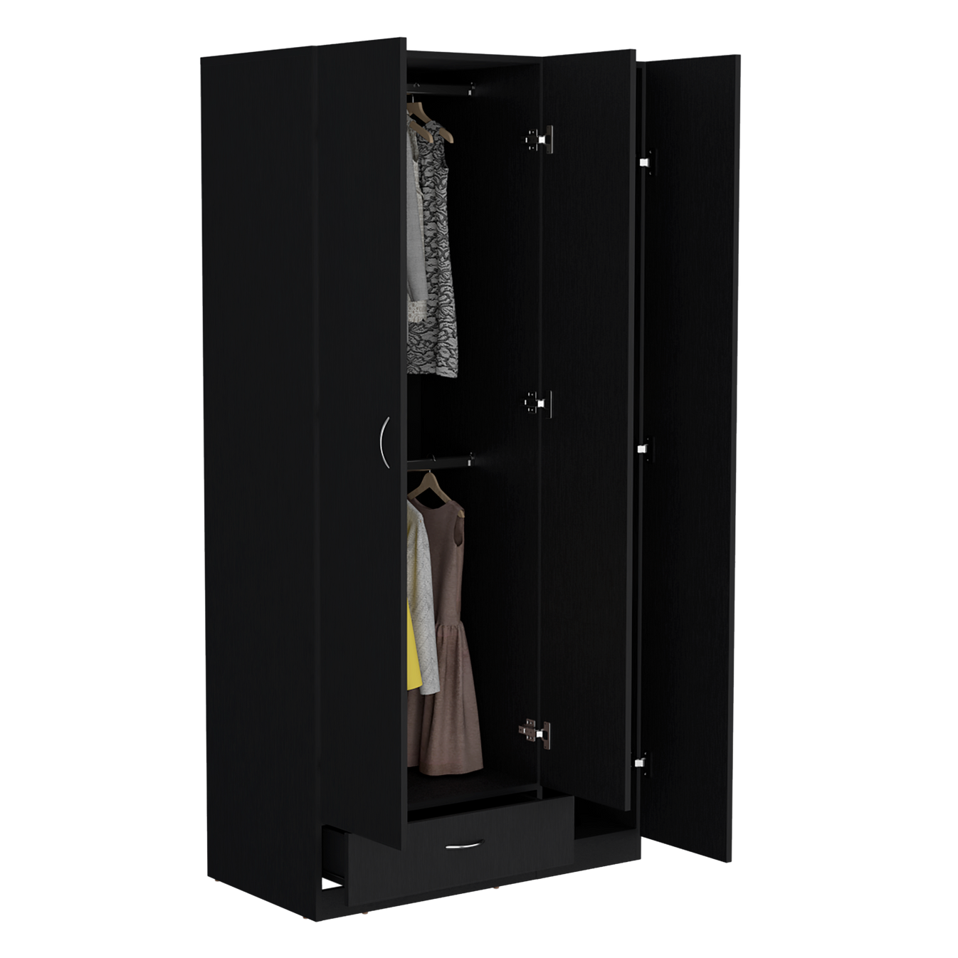 Transforma tu espacio con este armario de tres puertas batientes que combina estilo contemporáneo y máxima funcionalidad. Perfecto para mantener tu ropa y accesorios impecablemente organizados.