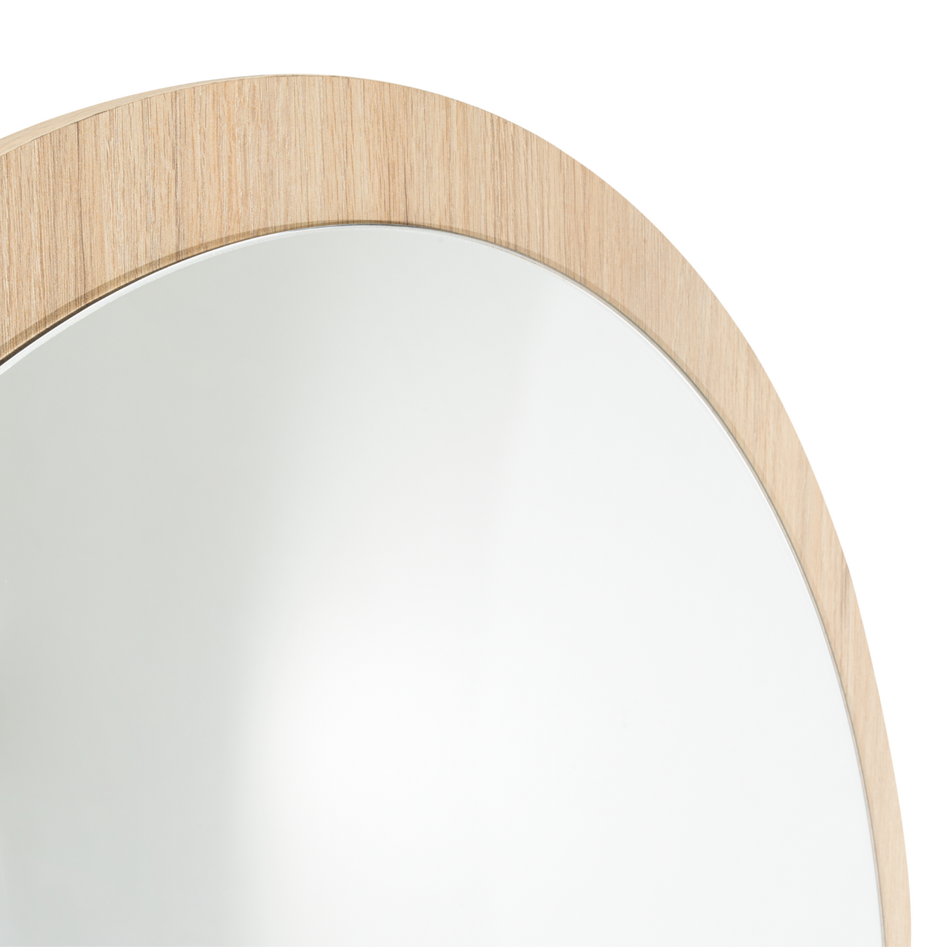 Su marco en madera MDP clara de 15mm aporta textura y presencia visual, mientras el espejo de 4mm de espesor garantiza un reflejo nítido y duradero. El detalle del chaflán en la parte posterior no solo facilita la instalación, sino que permite un ajuste perfecto contra la pared, logrando un acabado profesional sin complicaciones.